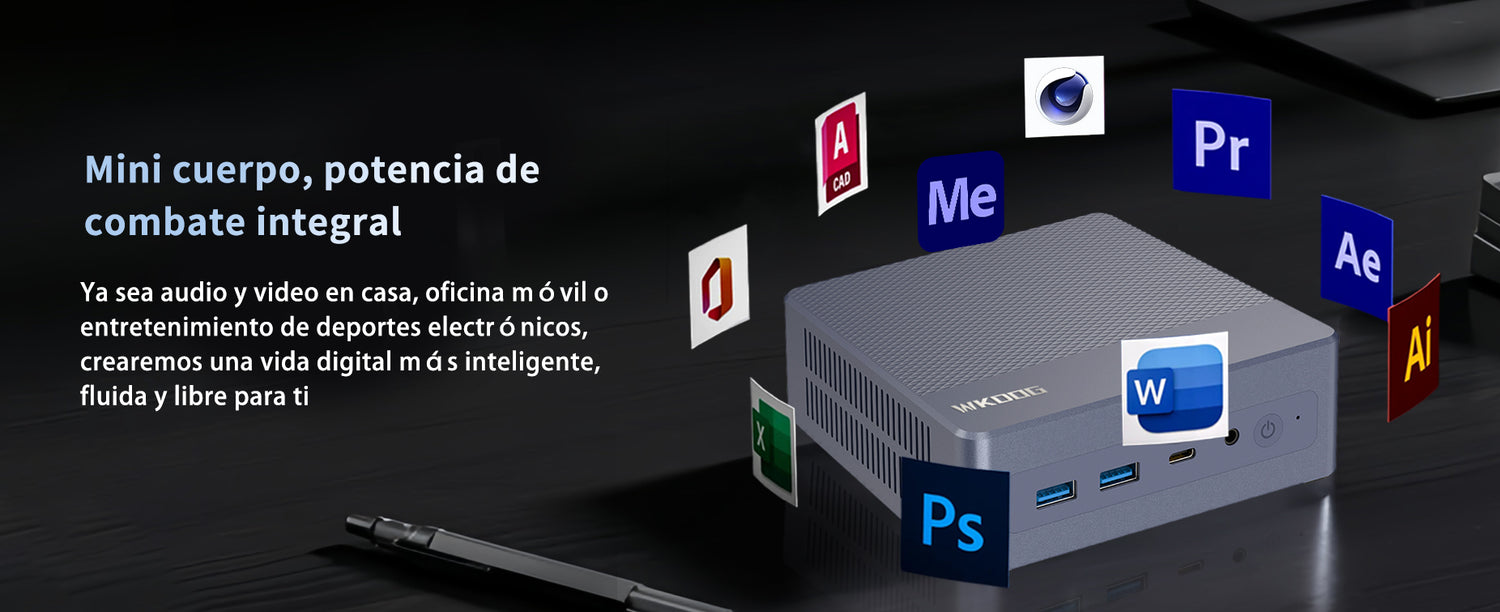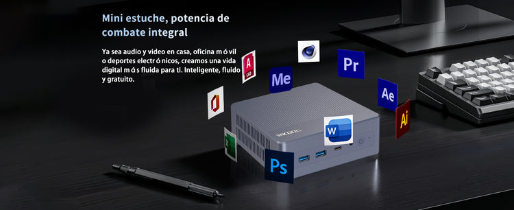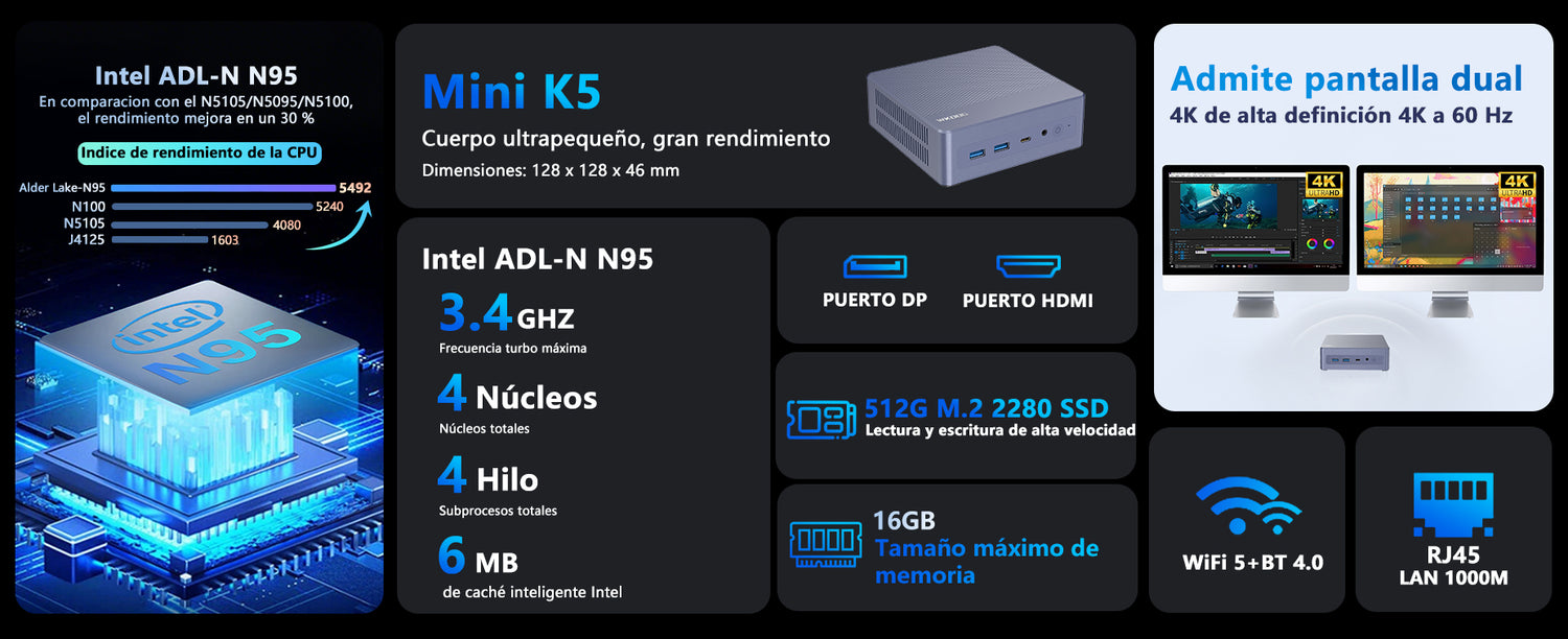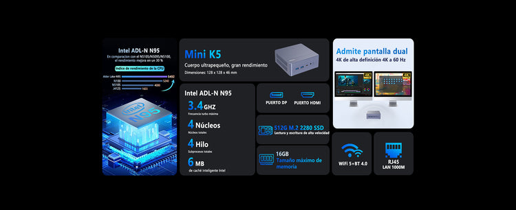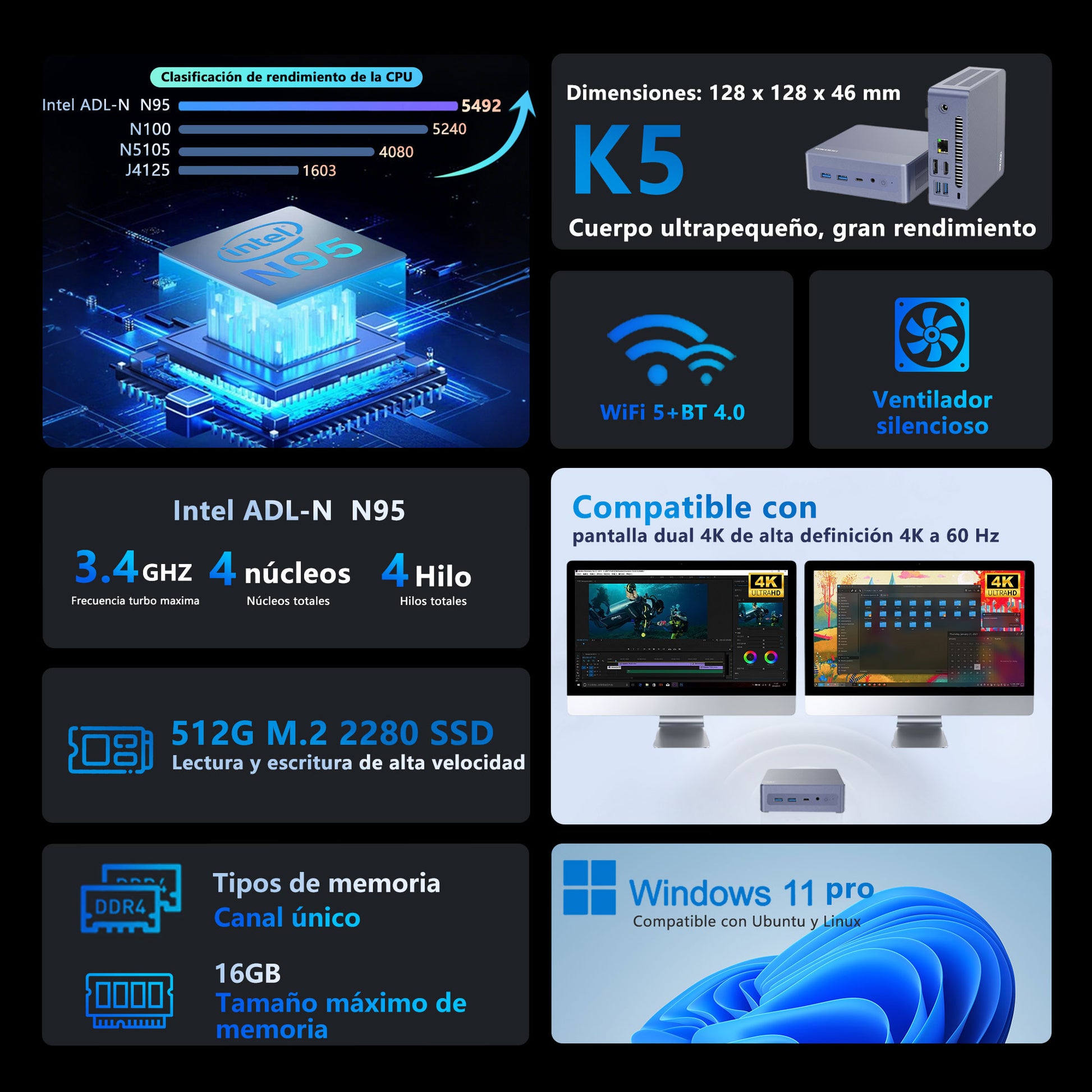 El Mini K5 es un dispositivo informático potente y compacto para aplicaciones eficientes de oficina, entretenimiento y creatividad. Su configuración básica incluye un SSD M.2 2280, que ofrece rápidas velocidades de lectura y escritura, mejorando significativamente la capacidad de respuesta del sistema y la eficiencia de la transferencia de archivos, y gestiona con fluidez el arranque del sistema, la carga de software y el procesamiento de archivos grandes. Equipado con un potente procesador y una tarjeta gráfica integrada, el Mini K5 permite realizar múltiples tareas y ofrece un rendimiento gráfico fluido, satisfaciendo las necesidades del uso diario en la oficina, el entretenimiento audiovisual y el diseño de iluminación.